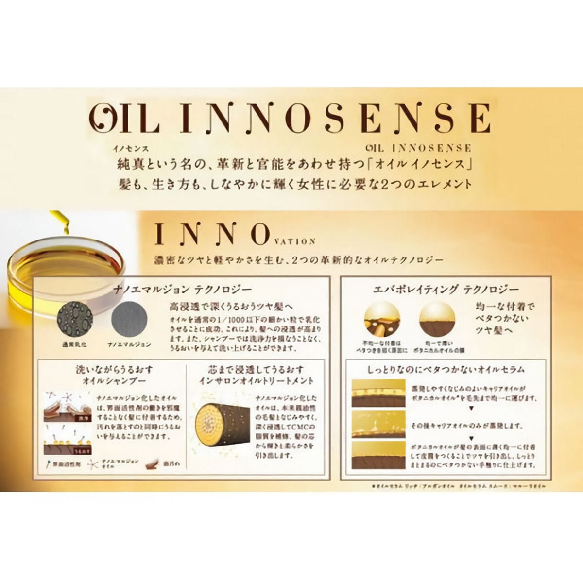 ナノエマルジョンテクノロジーで、オイル成分を通常のオイルトリートメントより3倍配合。ベタつくこともなく深い潤いとツヤを与えます。