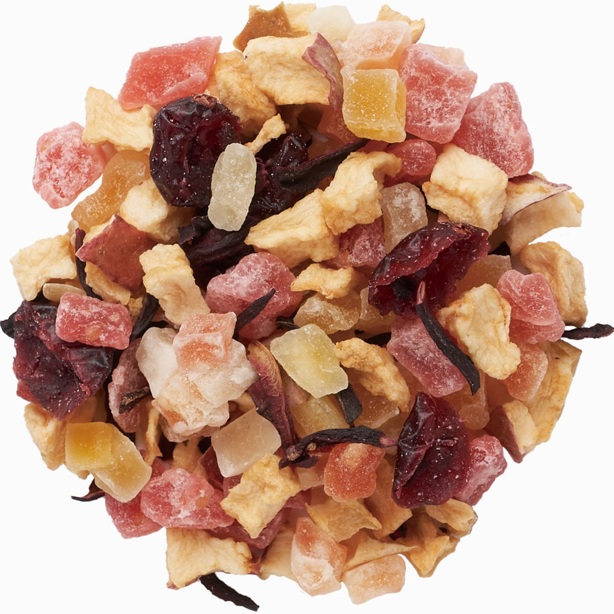 加糖ドライストロベリー(タイ製造)、有機ドライアップル、加糖ドライクランベリー、加糖ドライパパイヤ、加糖ドライマンゴー、有機ハイビスカス/香料、クエン酸、保存料(亜硫酸塩)、着色料(赤40)