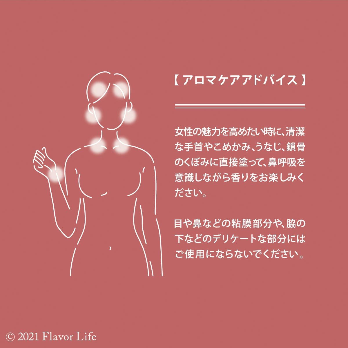女性の魅力を高めたいときに、清潔な手首やこめかみ、うなじ、鎖骨のくぼみに直接塗って、鼻呼吸を意識しながら香りをお楽しみください。